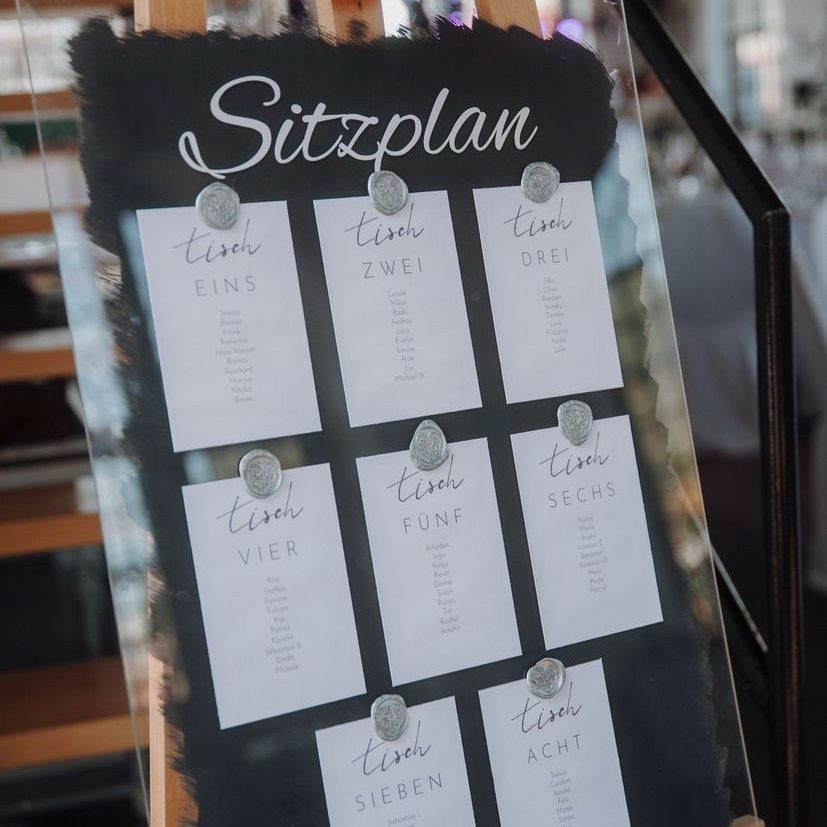 Die Hochzeitspaare drucken sich die Tischkärtchen selbst aus und befestigen sie entweder mit Fotoecken oder mit Wachs. Nach der Hochzeit wird dieses Schild gerne als Fotocollage von den Ehepaaren genutzt, sobald sie ihre Hochzeitsbilder haben.